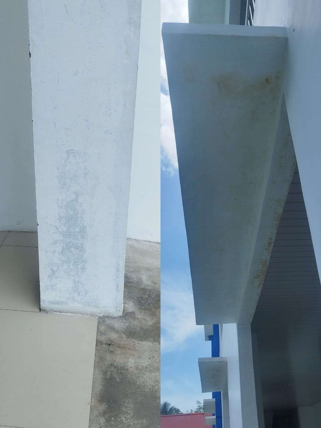 Namun, pantauan media di lapangan pada Februari 2026 menunjukkan kondisi cat di sejumlah bagian gedung tampak memudar, menguning, serta terlihat tidak merata. Pada bagian plafon luar bangunan terlihat noda kecoklatan seperti bekas rembesan air. Sementara pada beberapa tiang bangunan, cat terlihat belang dan terkesan tipis, bahkan memperlihatkan tekstur dasar dinding.