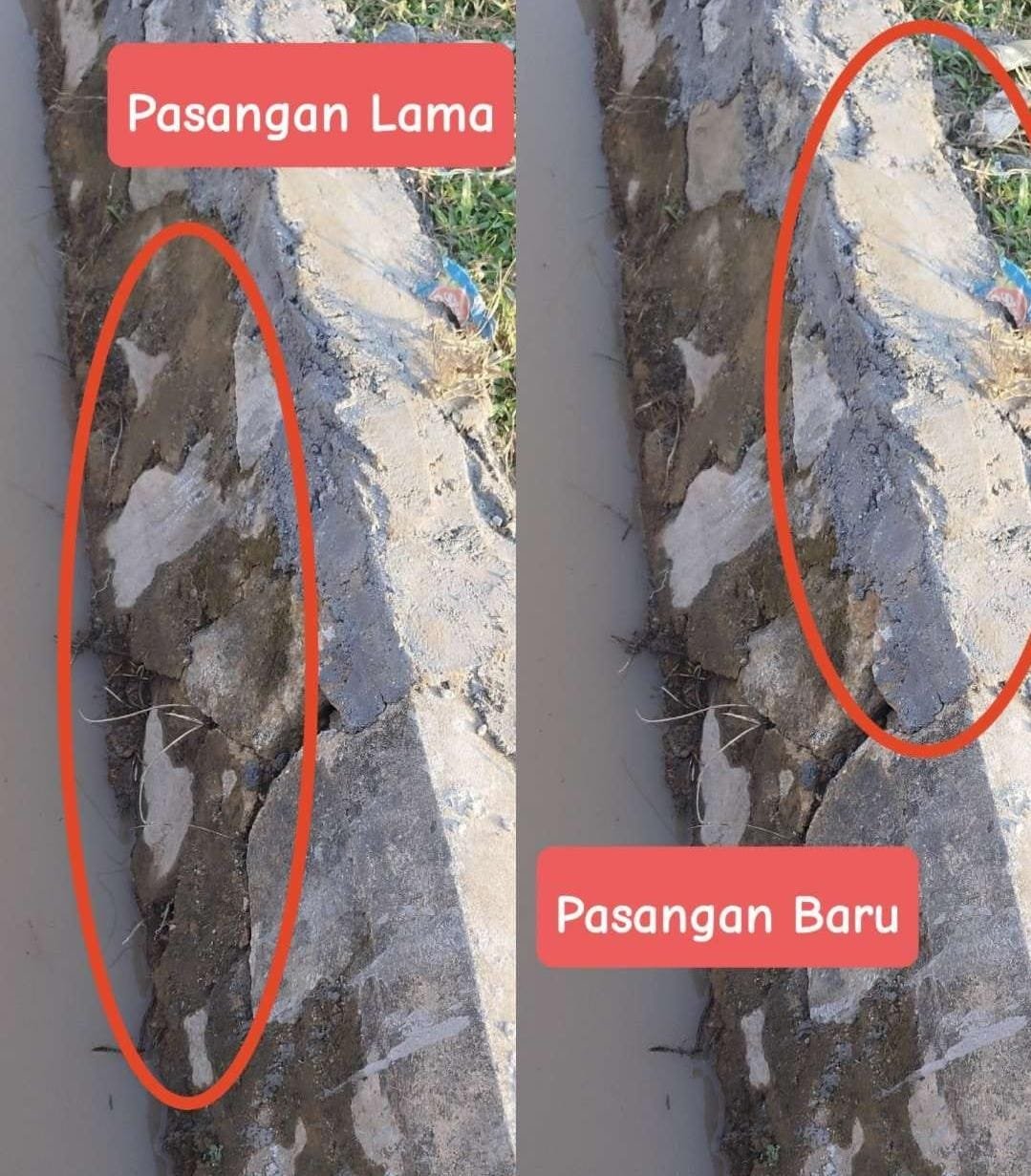 Dari pengamatan visual, permukaan batu di bagian bawah tampak sudah lama — berlumut dan kusam — sedangkan bagian atas memperlihatkan adukan semen baru. Ini memperkuat dugaan bahwa proyek yang diklaim “Pembangunan Baru” sebenarnya hanya merupakan perbaikan sebagian atau tambal-sulam dari saluran lama.
