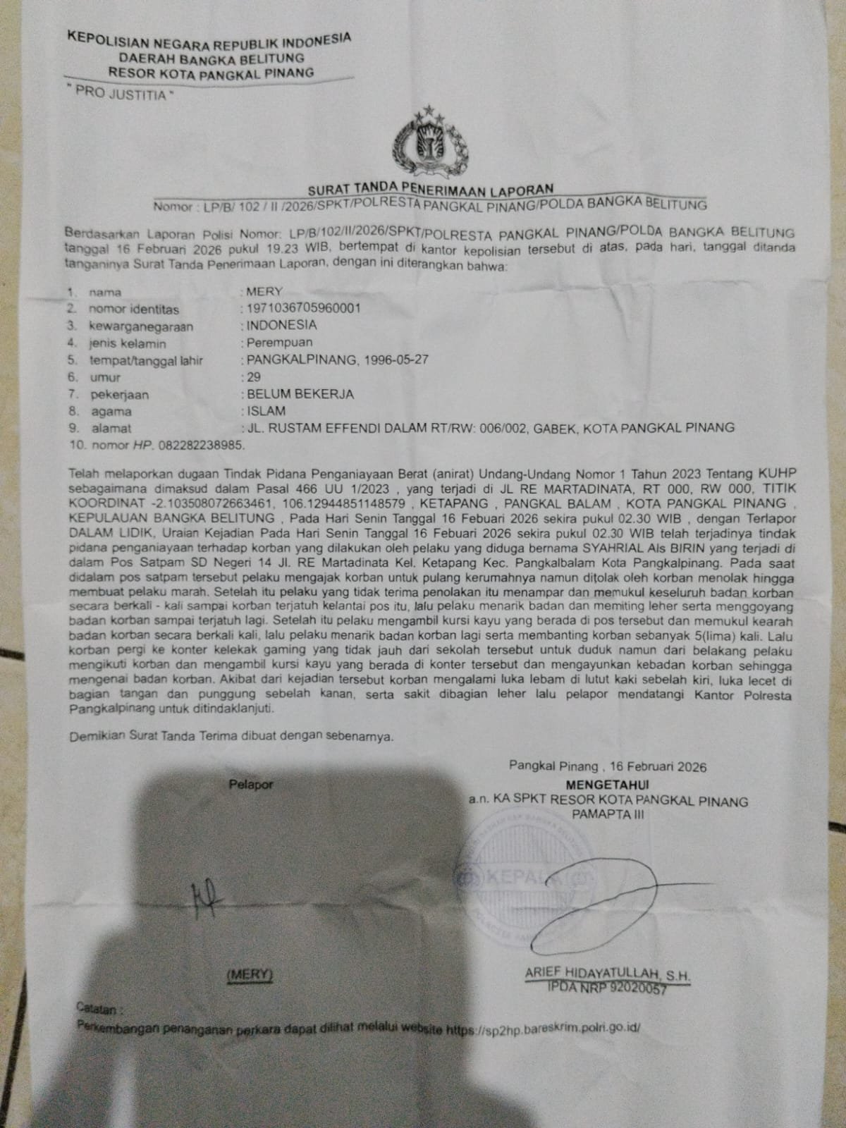 Menurut dari laporan Mr dengan nomor LP/B/102/II/2026/SPKT/POLRESTA PANGKALPINANG/POLDA BANGKA BELITUNG tanggal 16 Februari 2026 pukul 19.23 Wib.