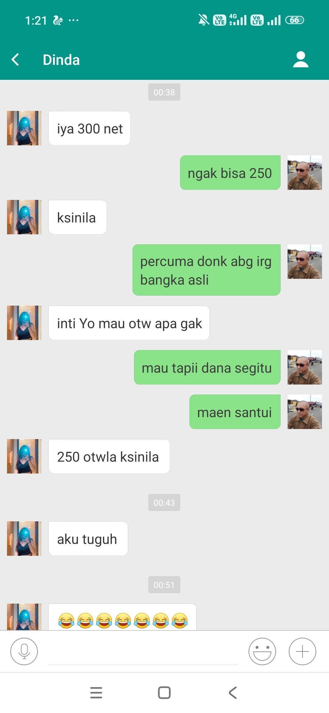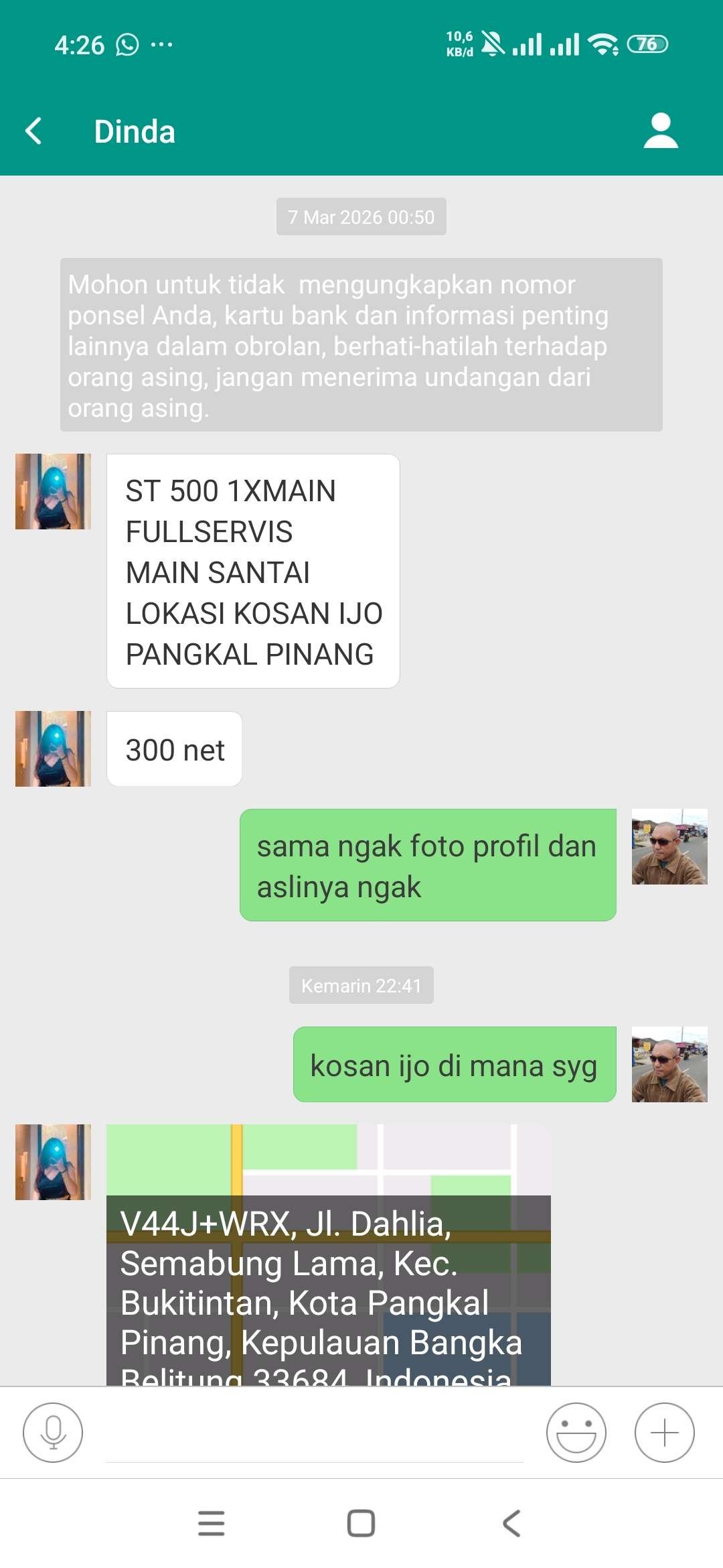 “Iya bang kosan Ijo, ku orang Bangka, 300 Net Bang, intinyo mau ataw tidak 250 otw la, kesinilah, aku tunggu”. ucap Dinda melalui pesan Mechat tawarkan harga kepada tim media.(11/3)